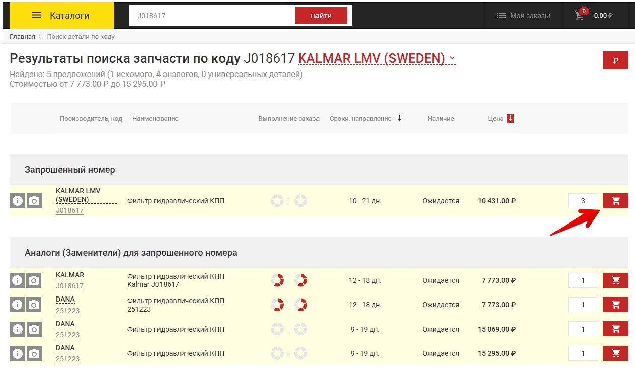 - Выберите из представленных предложения то, которое подходит именно Вам, ориентируясь при выборе на оригинальную запчасть, аналоги, цену, срок доставки (указаны в рабочих днях) и данные статистики по поставщику.