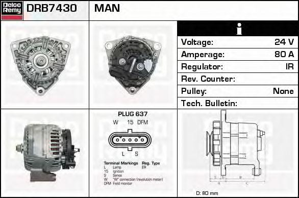DRB7430 DELCO REMY Генератор 24в 80 ампер, ima207039