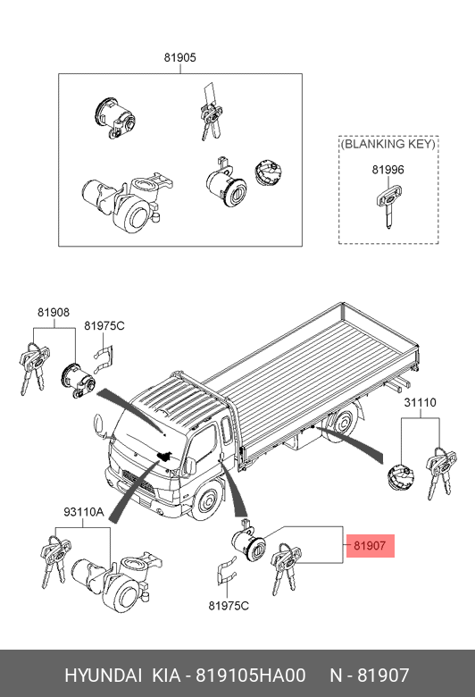819105HA00 HYUNDAI Личинка HYUNDAI HD65,72,78 замка лев.двери с ключом OE